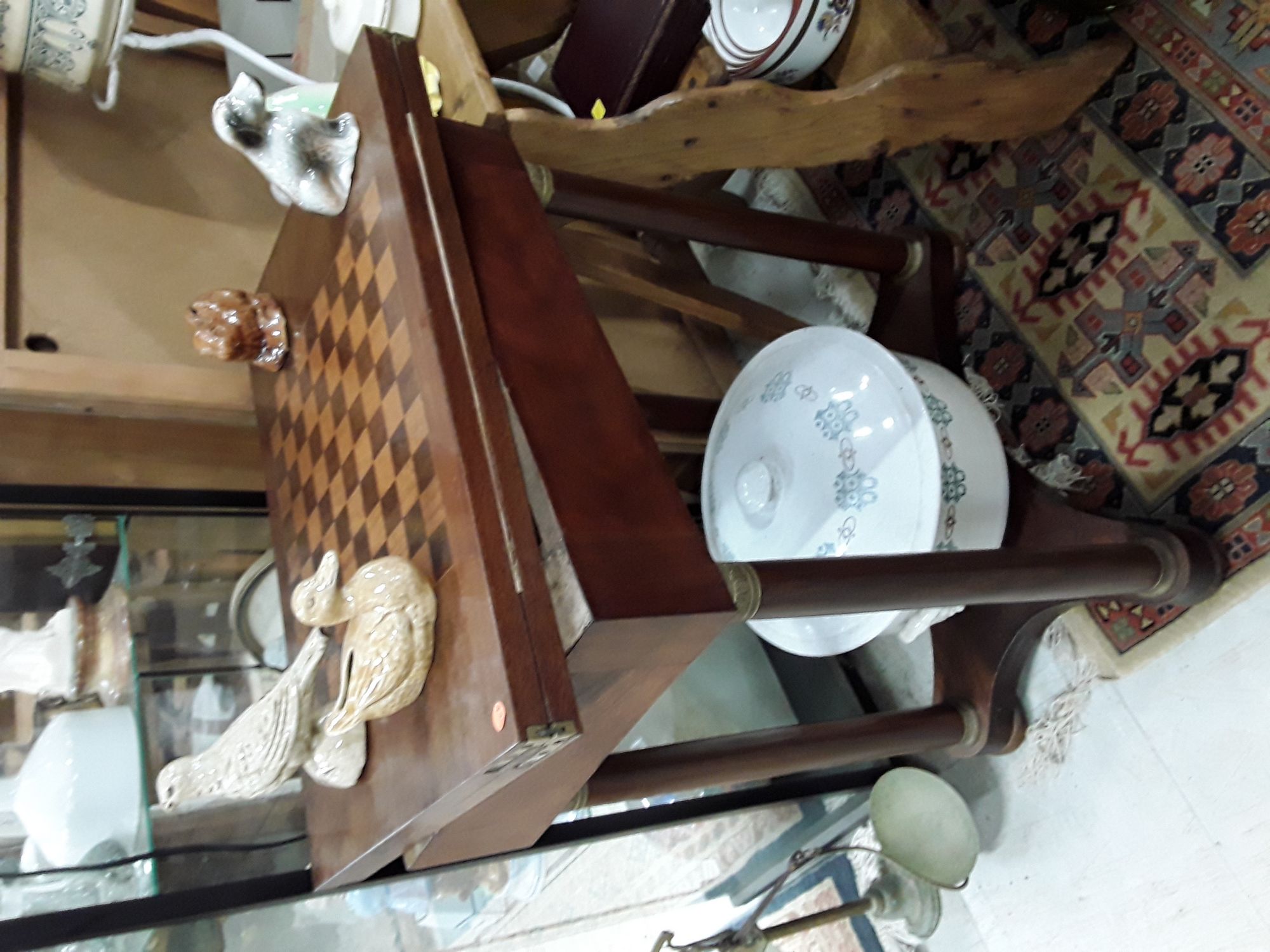 Petit modèle de table à jeu avec plateau pivotant et ouvrant sur un intérieur en cuir. Peut servir aussi de console.(Prix=490 euros) .Plateau fermé = 38 cm X 55 cm, H=73 cm