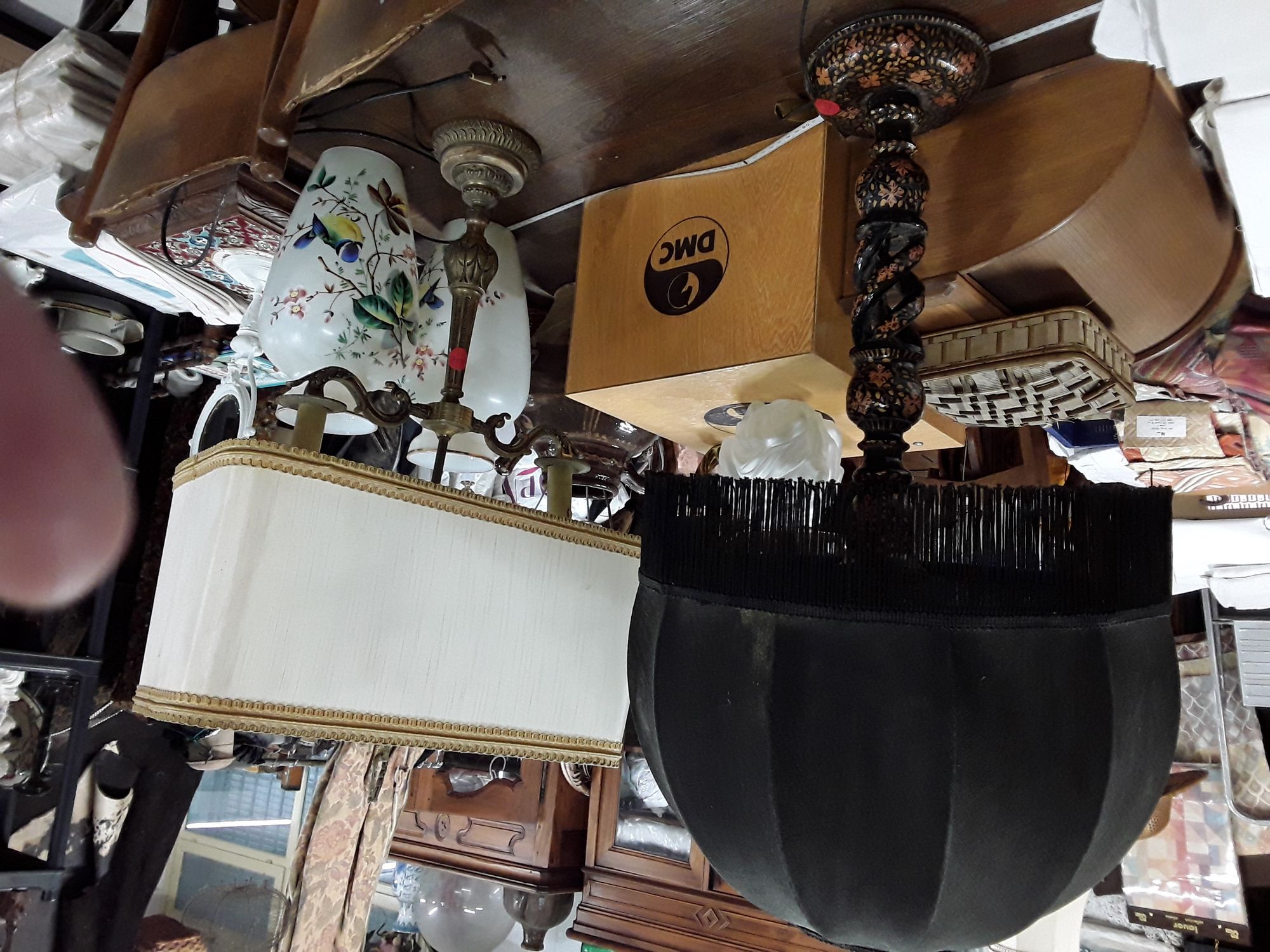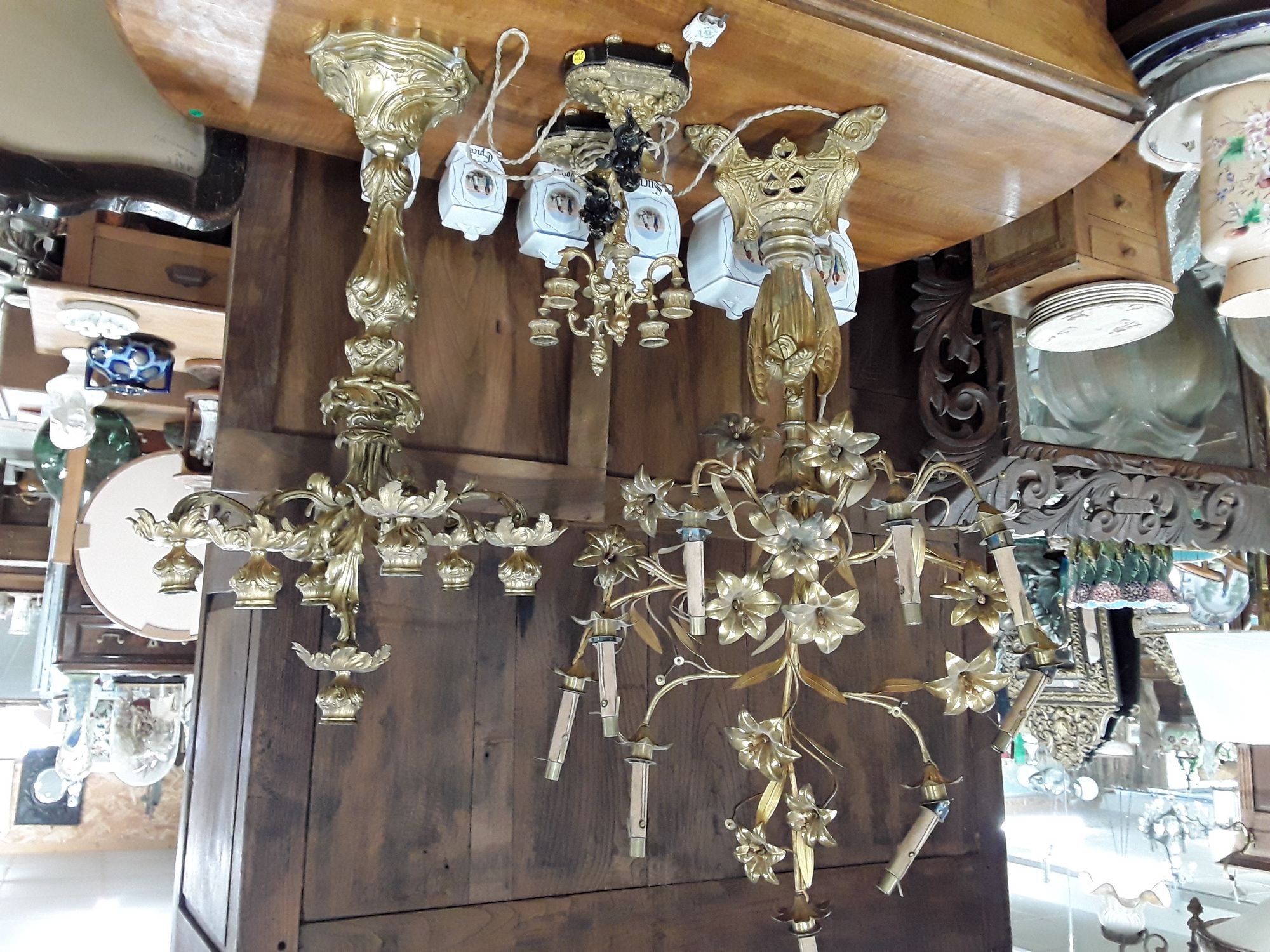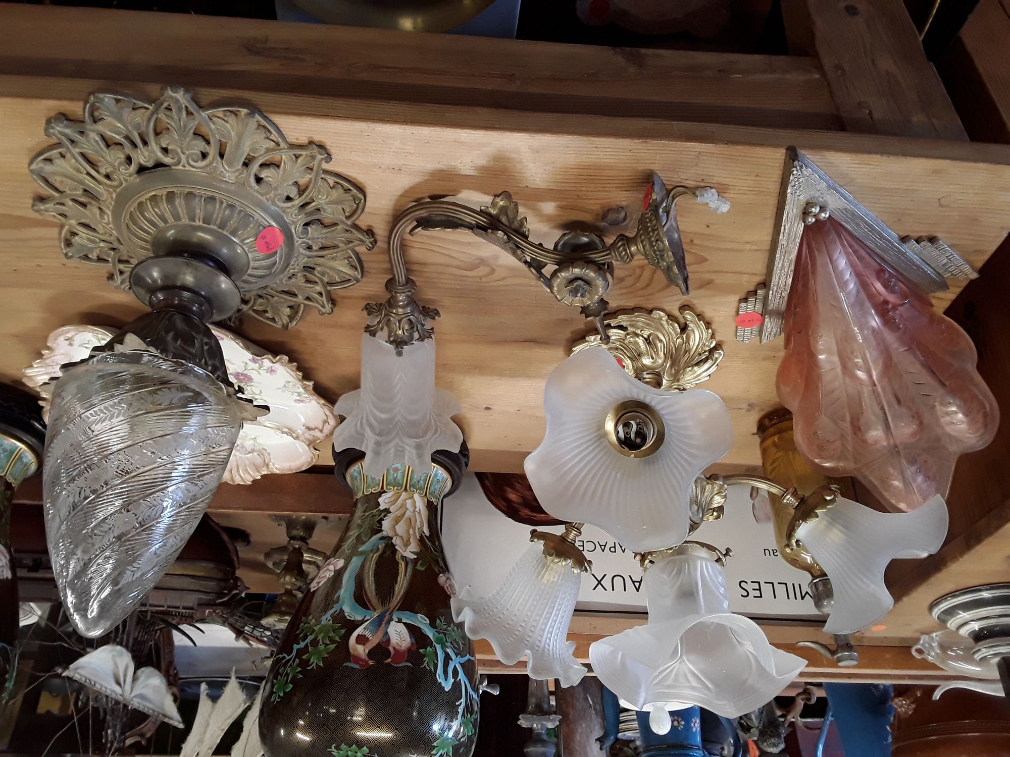 Au centre : très beau lustre avec ses tulipes ; à droite : plafonnier avec un joli verre gravé ; à gauche : applique des années quarante
