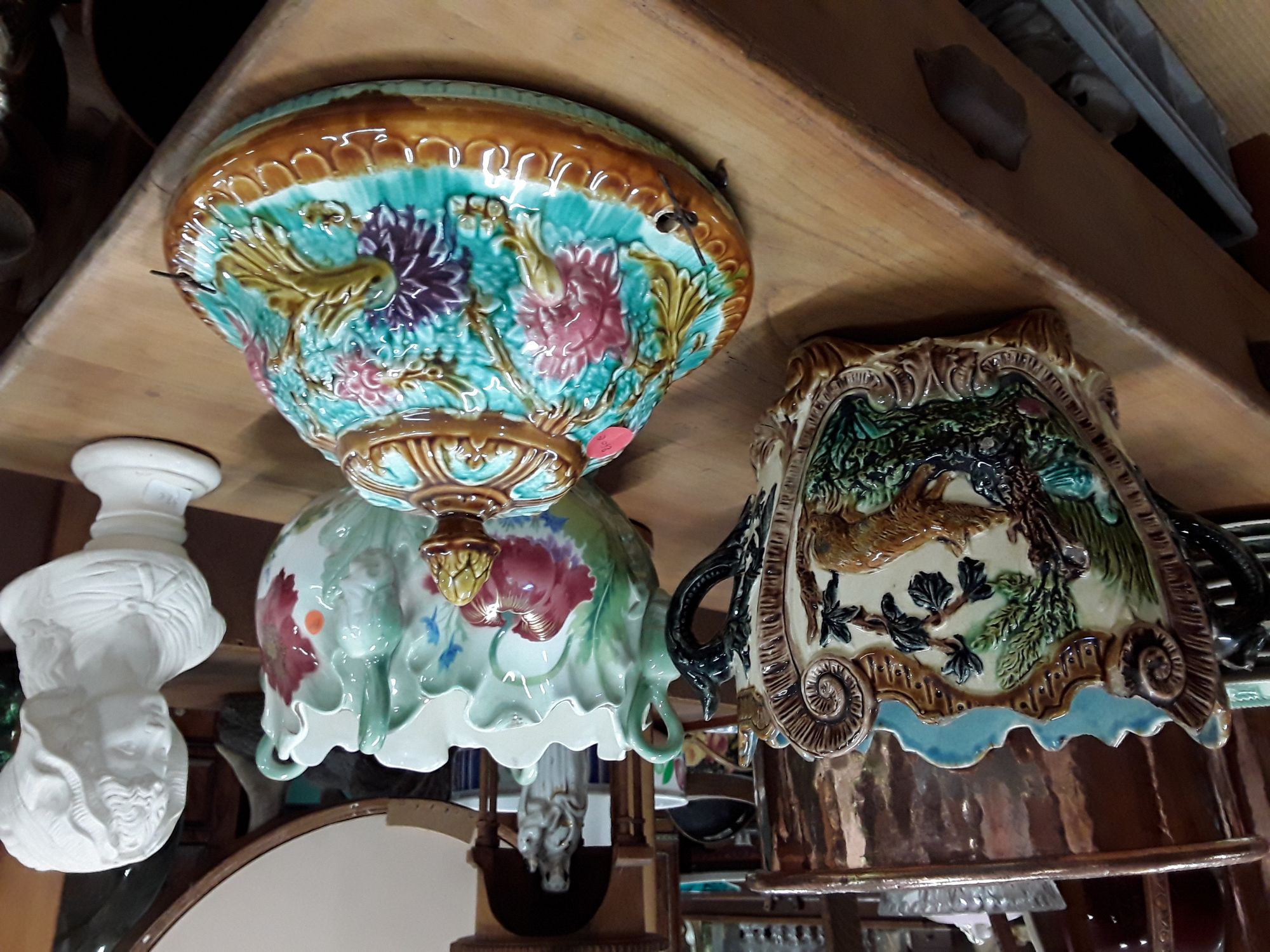Au premier plan très jolie suspension pour mettre une fleur(240 Euros) ,à ses côtés cache-pot sur le thème des fables de LA FONTAINE (ici le renard) (présente des petits manques)