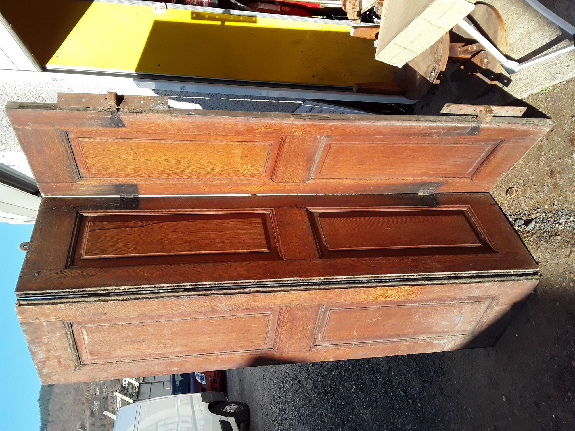 Vieux volets en trois pans articulés avec encore deux charnières d'origine ,présentés ici en l'état avant restauration. H=1m85 X 3fois 44cm