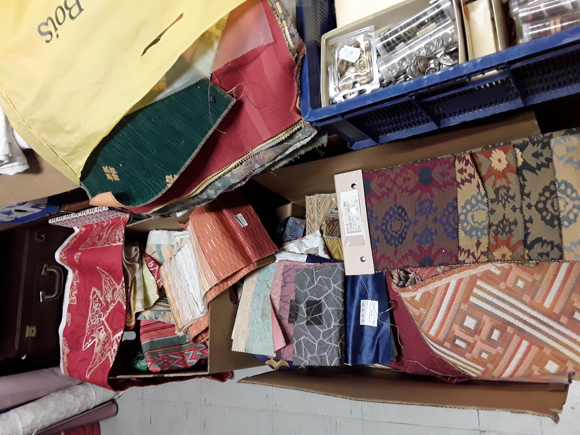 Grand lot d'échantillons de tissu de décoration provenant d'un ancien stock de tapissier. Il reste aussi quelques rouleaux de couleur unie